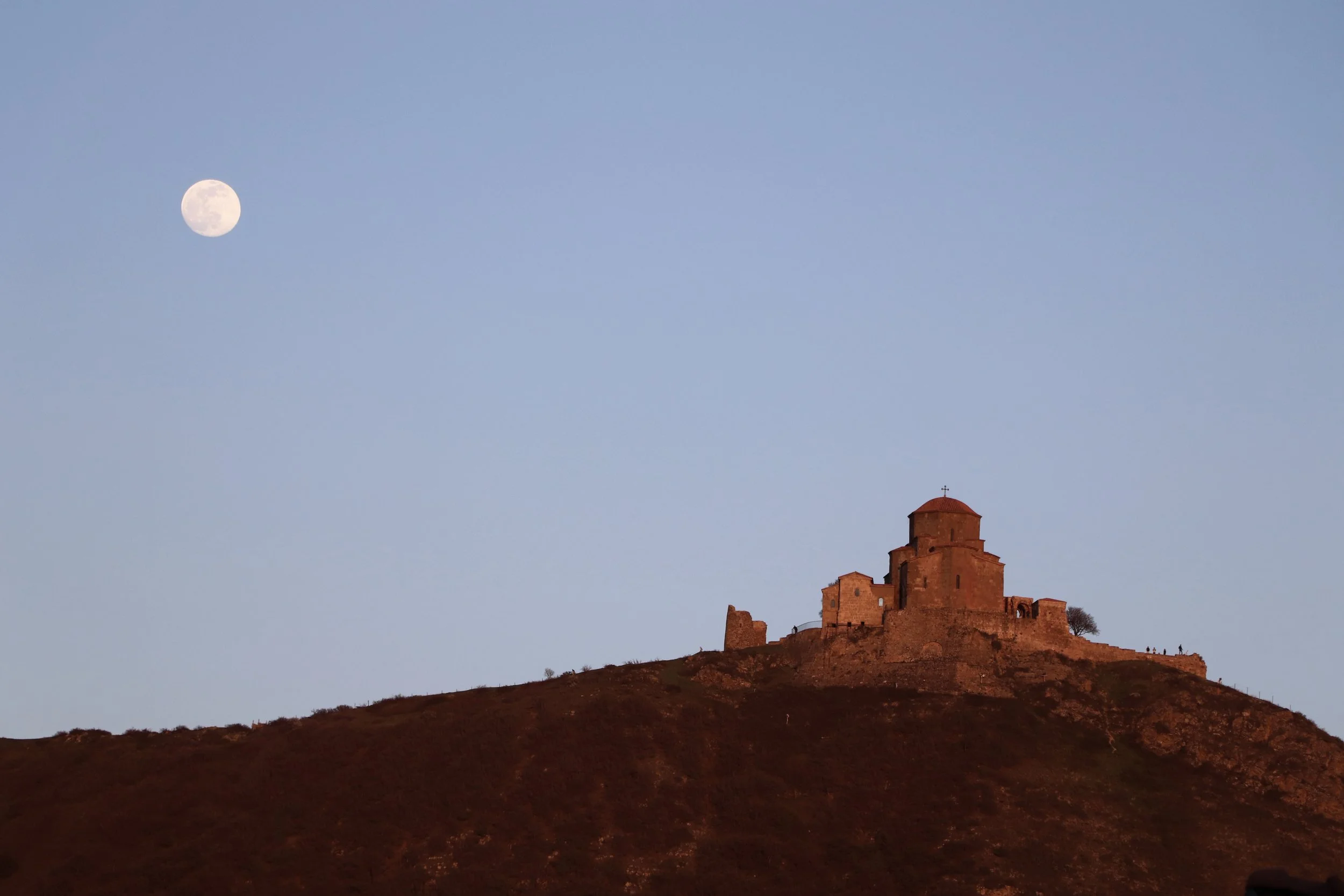 Perched on the hill top and standing proudly on the horizon is the Jvari Monastery - If you are around at dusk a fantastic photo opportunity comes when the Monastery glows red with the last of the sun and the moon rises over the hills. We headed up to Jvari Monastery the next day where we were rewarded with both beautiful architecture and panoramic views.